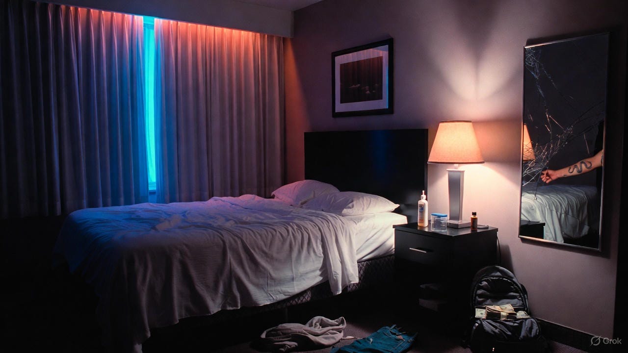 Room smells like someone tried to murder the evidence with industrial bleach and lost the fight. Cheap carpet shampoo clings to the air, mixed with old smoke and something sour under the bed. I crack the window anyway. Parking-lot noise leaks in: diesel engines idling, a couple screaming by the ice machine, the neon VACANCY sign buzzing red like a heartbeat. I light a smoke, let the cherry glow while I wait, ash tapping into a plastic cup.